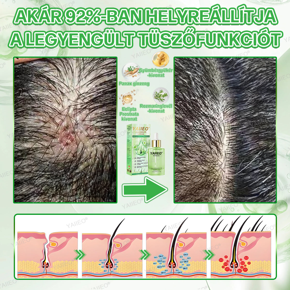 A YAIIEOÂź hajserkentĆ szĂ©rum aktĂv növĂ©nyi összetevĆket juttat a hajhagymĂĄk gyökerĂ©hez, fokozza a felszĂvĂłdĂĄst, aktivĂĄlja az elgyengĂŒlt hajhagymĂĄkat, Ă©s olyan fejbĆr-környezetet teremt, amely elĆsegĂti a sƱrƱbb Ă©s erĆsebb haj növekedĂ©sĂ©t.